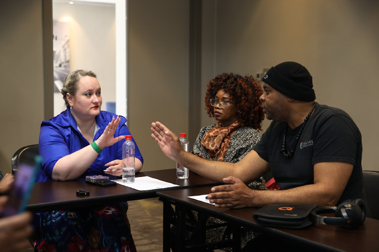 Singer Mercy Pakela and Tshepo Mashiane corner Samro secretary Marianne Fourie after interrupting a press briefing. Photo: Refilwe Kholomonyane